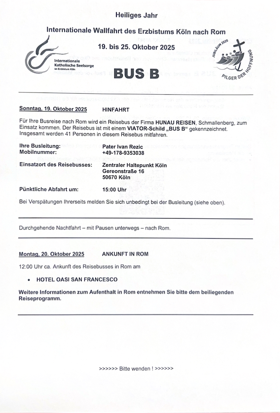 Polazak na hodočašće u Rim je u nedjelju 19. listopada 2025. u 15 sati sa sljedeće adrese: