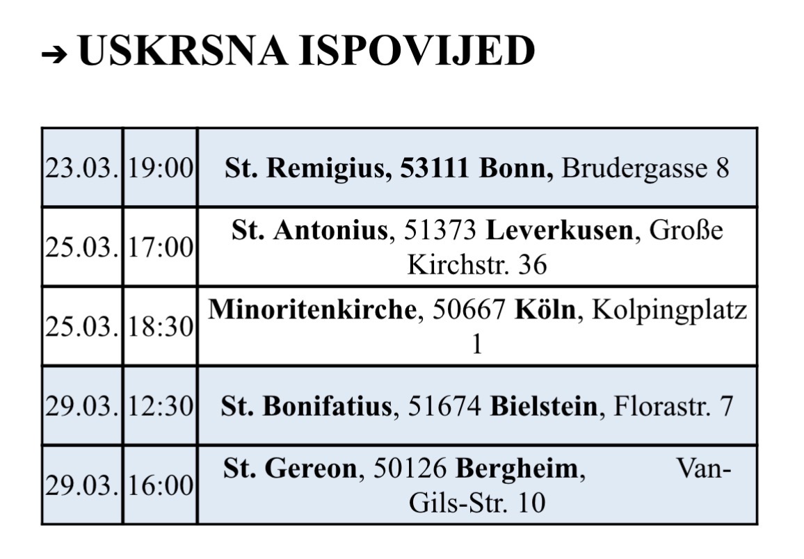 HKM KÖLN: RASPORED USKRSNE ISPOVIJEDI 2026.