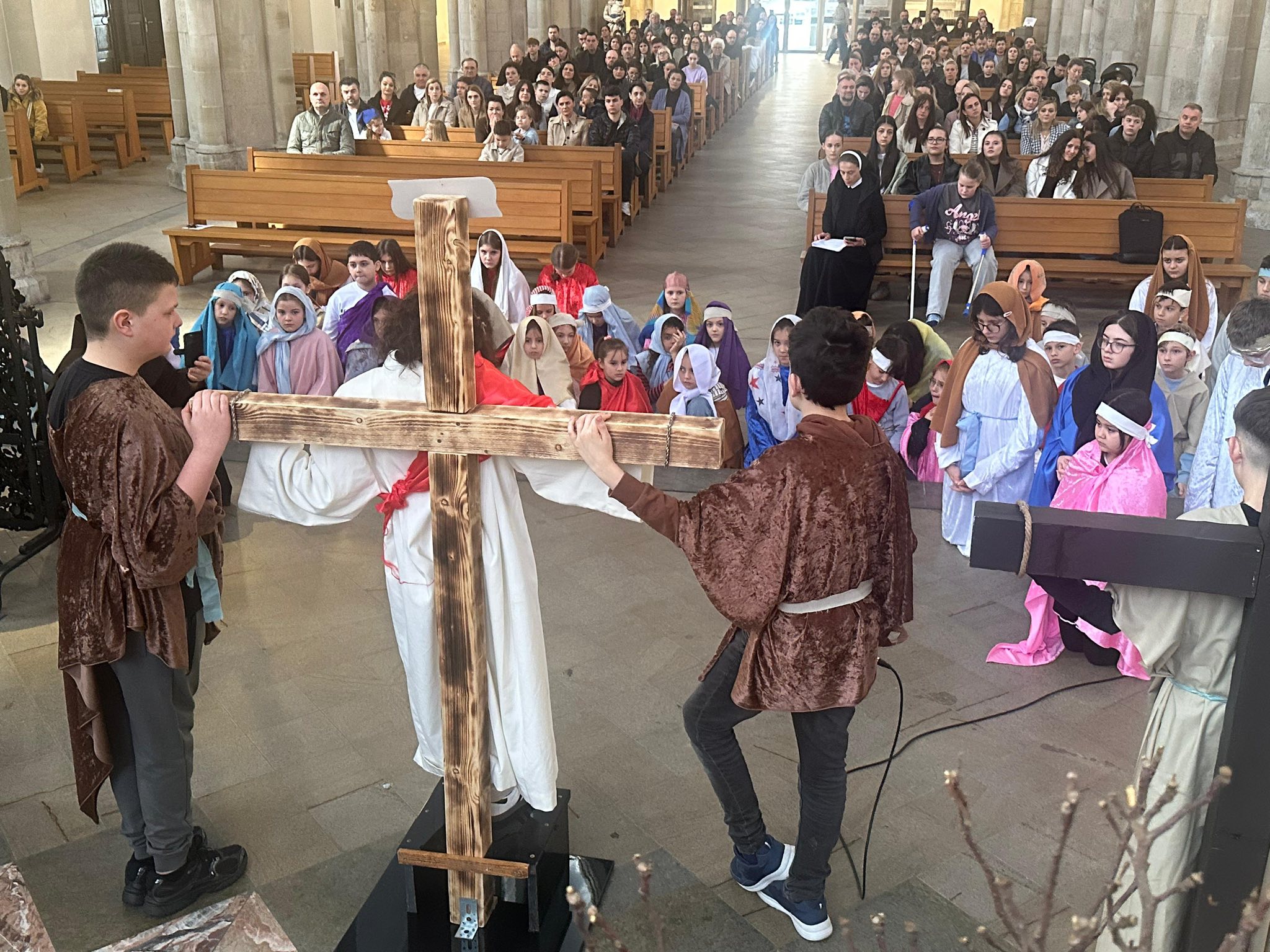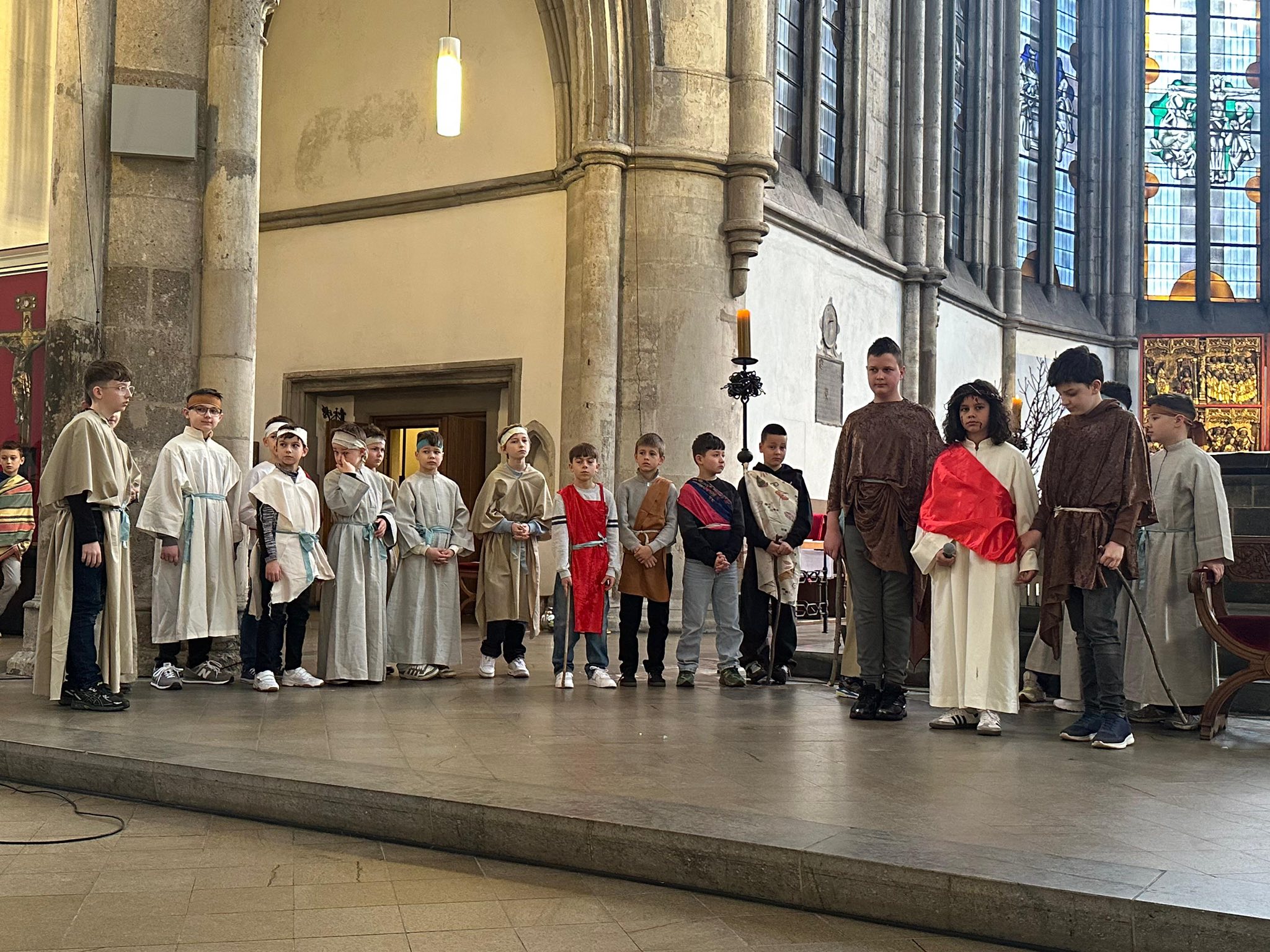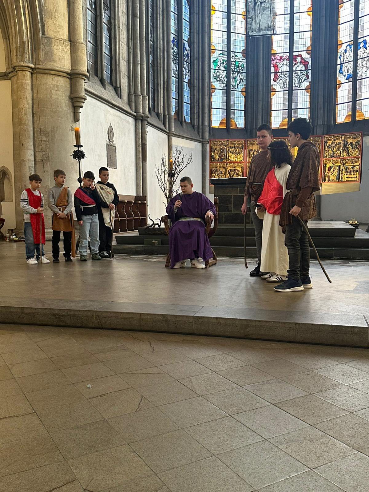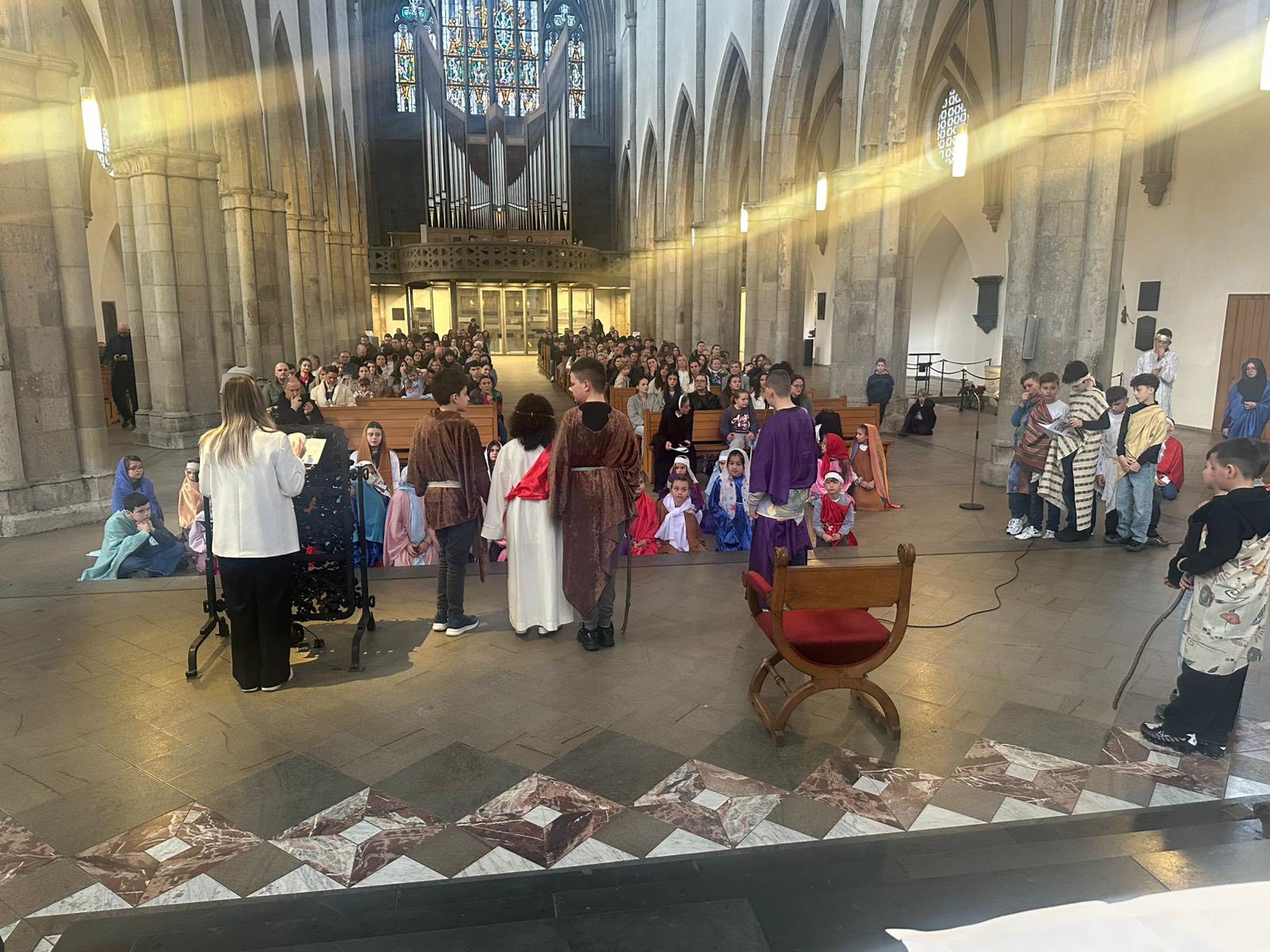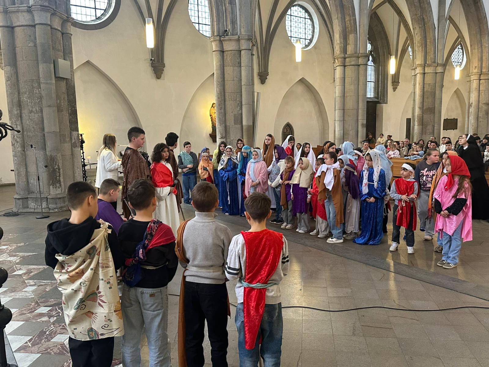 U subotu, 21. ožujka 2026. godine, s početkom u 10 sati, u crkvi Minoritenkirche u Kölnu, umjesto redovite nastave vjeronauka, uprizorena je Posljednja večera i slike muke Kristove. U pobožnosti su sudjelovali vjeroučenici nižih razreda. Tekst je izražajno i meditativno čitala Laura Rajić, predsjednica Frame, dok su djecu za ovaj poseban korizmeni susret pripremale vjeroučiteljice s. Renata Rapi i s. Bora Marki, zu osobitu pomoć župljanki Anite Bilić i Marije Đerek te župljana gosp. Slavka Bočeka i gosp. Damir Križića. Zajedno s njima s. Renata i s. Bora su osmislile i izradile prigodne kostime te kreirale scenografiju. U programu je sudjelovalo pedesetak djece, odjevene u prigodne kostime. Ulogu Isusa već treću godinu zaredom uprizorio je Mario Vrdoljak. Birane slike posljednjih trenutaka iz Isusa ovozemnog života, ispunjene dječjom iskrenošću, jednostavnošću i vjerom, nikoga nisu ostavile ravnodušnim. Osim djece, u pobožnosti i misnom slavlju sudjelovali su njihovi roditelji, bake i djedovi.